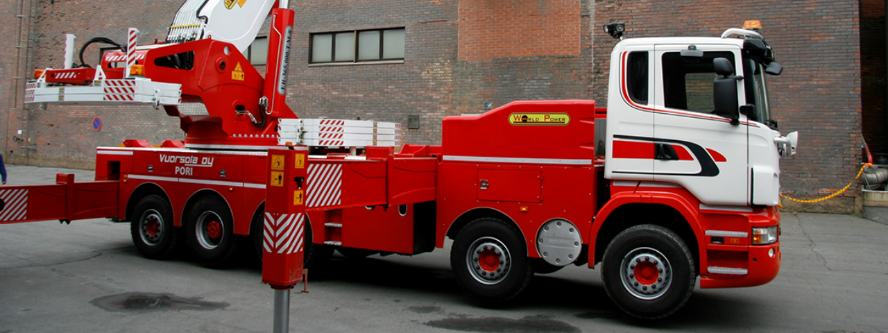 Maastokelpoinen nosturiajoneuvo, jonka jokapyöräveto ansiosta ajoneuvolla päästään kulkemaan haasteellisemmassakin maastossa.
